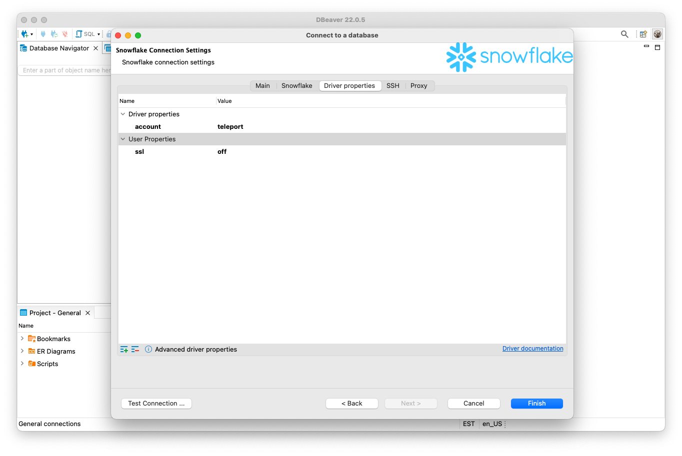 다음으로 "Driver properties" 탭을 클릭하고 "account"를 임의의 값(예: "teleport")으로 설정합니다; "Password"와 마찬가지로 "account"의 값은 연결을 설정할 때 무시되지만 DBeaver가 데이터베이스를 등록하는 데 필요합니다. "User properties"에서 "ssl"을 off 로 설정합니다: